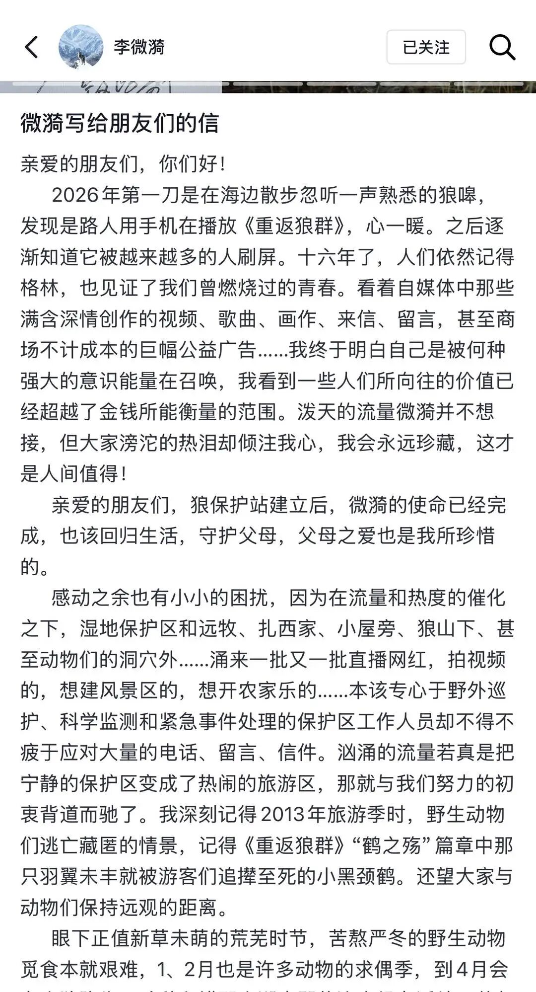 李微漪的长文中,也提到近期“格林”热让一批批直播网红涌入,给四川若尔盖湿地国家级自然保护区的工作人员的工作带来不便,也打扰了当地野生动物原本的生活节奏,“汹涌的流量若真是把宁静的保护区变成了热闹的旅游区,那就与我们努力的初衷背道而驰了”。她也发出呼吁:“此时不去打扰是我们最温柔的祝福。朋友们能否换一种方式去陪伴格林呢?把爱意藏在心里,把空间还给自然。”