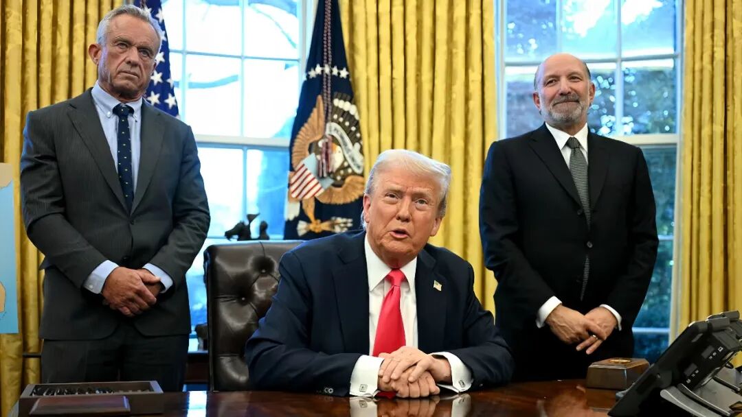 ·2025年2月,特朗普(中)在白宫椭圆形办公室。(美国有线电视新闻网)
