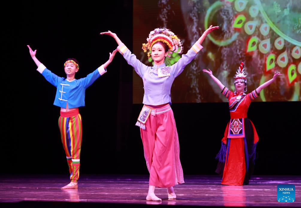 Dancers perform at the "Happy Chinese New Year in Bishkek 2026" cultural show in Bishkek, Kyrgyzstan, Feb. 4, 2026. The show was presented by a joint artistic group composed of Fujian Vocational College of Art, Fujian Acrobatic Troupe, Fujian song and dance theater, and Quanzhou Gaojia Opera Heritage Center. The program included songs, dances, magic, acrobatics, local opera, and instrumental performances. Nearly 900 people watched the show at the scene.[Photo/Xinhua]