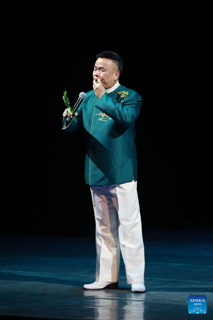 An artist plays a song by blowing leaves at the "Happy Chinese New Year in Bishkek 2026" cultural show in Bishkek, Kyrgyzstan, Feb. 4, 2026. The show was presented by a joint artistic group composed of Fujian Vocational College of Art, Fujian Acrobatic Troupe, Fujian song and dance theater, and Quanzhou Gaojia Opera Heritage Center. The program included songs, dances, magic, acrobatics, local opera, and instrumental performances. Nearly 900 people watched the show at the scene.[Photo/Xinhua]