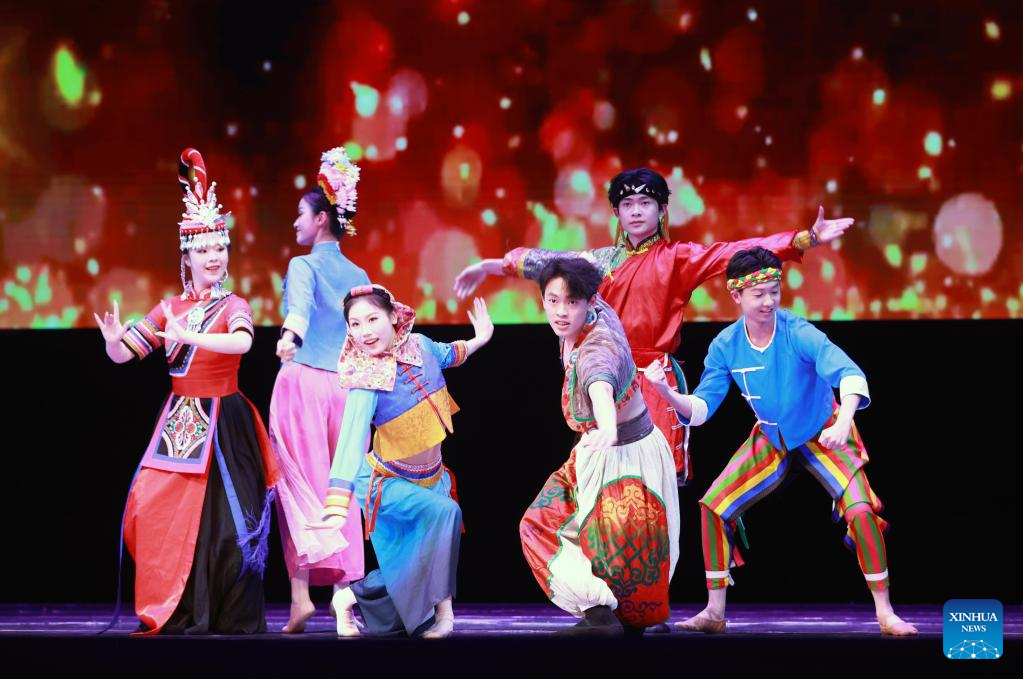 Dancers perform at the "Happy Chinese New Year in Bishkek 2026" cultural show in Bishkek, Kyrgyzstan, Feb. 4, 2026. The show was presented by a joint artistic group composed of Fujian Vocational College of Art, Fujian Acrobatic Troupe, Fujian song and dance theater, and Quanzhou Gaojia Opera Heritage Center. The program included songs, dances, magic, acrobatics, local opera, and instrumental performances. Nearly 900 people watched the show at the scene. [Photo/Xinhua]