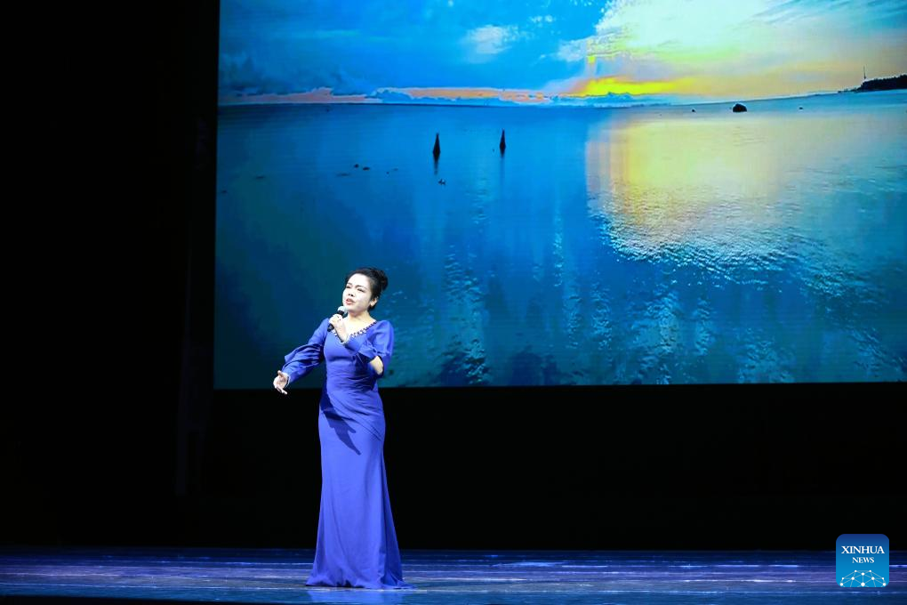 A singer performs at the "Happy Chinese New Year in Bishkek 2026" cultural show in Bishkek, Kyrgyzstan, Feb. 4, 2026. The show was presented by a joint artistic group composed of Fujian Vocational College of Art, Fujian Acrobatic Troupe, Fujian song and dance theater, and Quanzhou Gaojia Opera Heritage Center. The program included songs, dances, magic, acrobatics, local opera, and instrumental performances. Nearly 900 people watched the show at the scene.[Photo/Xinhua]