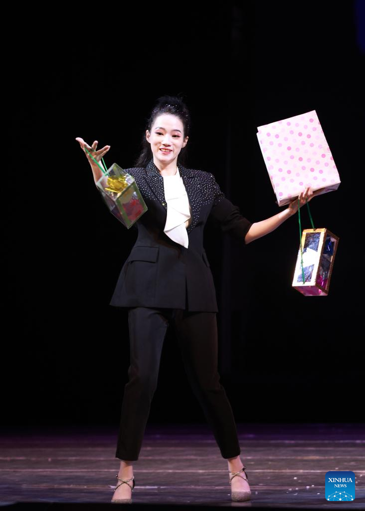 A magician performs at the "Happy Chinese New Year in Bishkek 2026" cultural show in Bishkek, Kyrgyzstan, Feb. 4, 2026. The show was presented by a joint artistic group composed of Fujian Vocational College of Art, Fujian Acrobatic Troupe, Fujian song and dance theater, and Quanzhou Gaojia Opera Heritage Center. The program included songs, dances, magic, acrobatics, local opera, and instrumental performances. Nearly 900 people watched the show at the scene.[Photo/Xinhua]