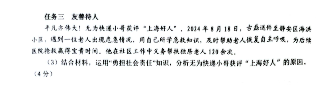 今年1月底,在芜湖无为市刘渡中学八年级“道德与法治”期末考试中,古磊的女儿乐乐(化名)意外发现试卷题目上印着自己爸爸的名字,考题上写道:“平凡亦伟大!无为快递小哥获评‘上海好人’。古磊送件至静安区海洪小区,遇到一位老人出现危急情况,用自己所学急救知识,及时帮助老人恢复自主呼吸,为后续医院抢救赢得宝贵时间。他在社区工作中义务帮扶独居老人120余次。结合材料,运用‘勇担社会责任’知识,分析无为快递小哥获评‘上海好人’的原因”。