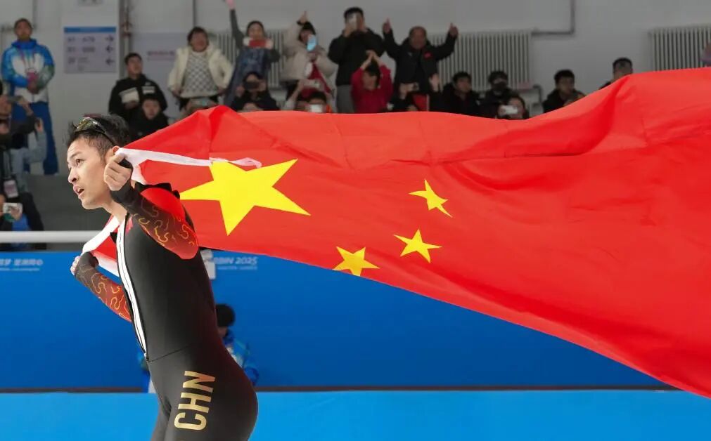 2025年哈尔滨亚冬会开幕式上,宁忠岩以旗手身份站在了家乡父老的面前。在速度滑冰男子1500米比赛中,他以1分45秒85的成绩强势夺冠,并打破亚洲纪录。接着,他在1000米比赛中再次问鼎。斩获双冠的他,露出了灿烂的笑容。