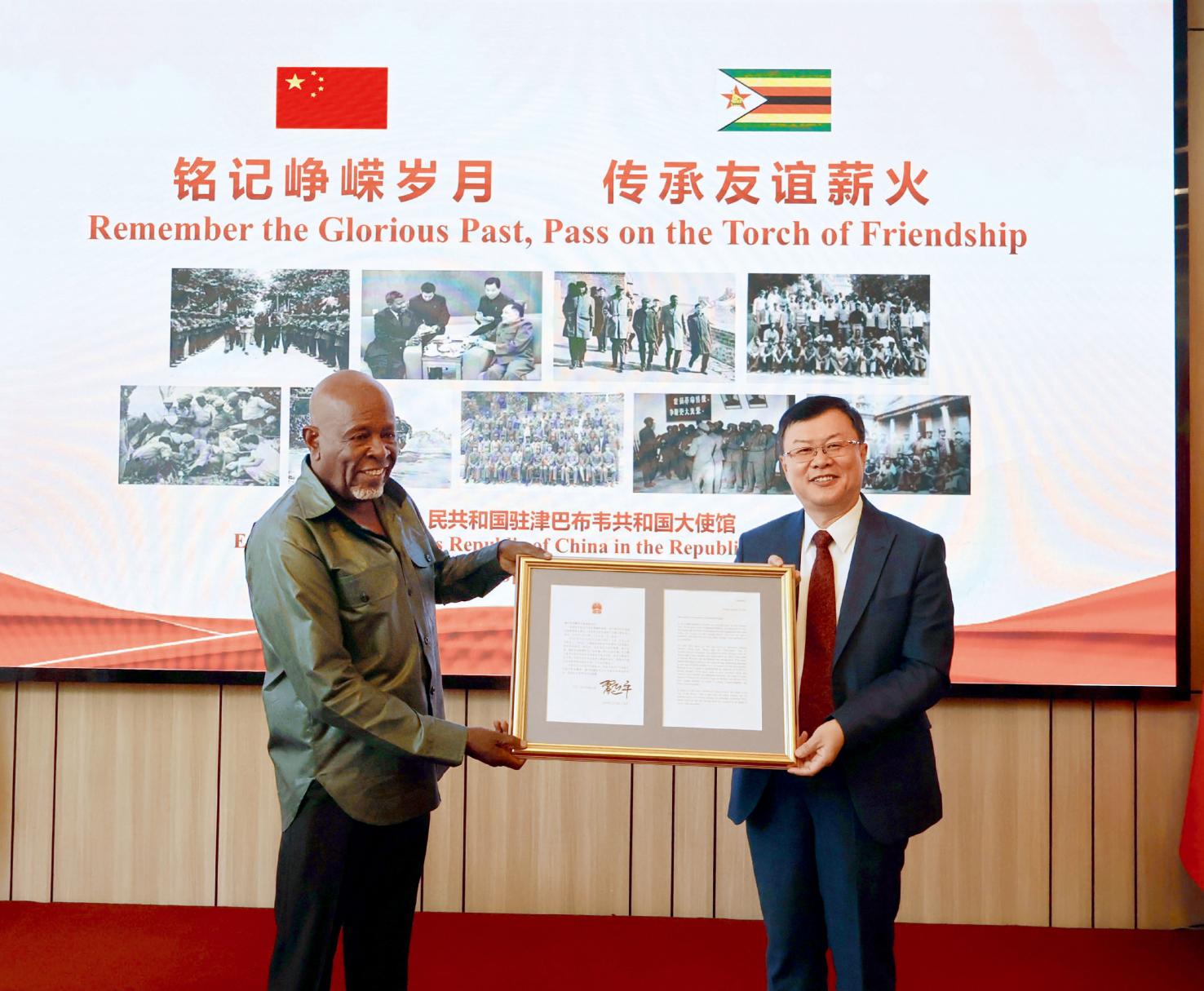 2026年1月,穆尚圭(左)在中国驻津巴布韦大使馆,作为津巴布韦解放斗争老战士代表,接过中国驻津巴布韦大使周鼎(右)代为转交的习近平主席的复信。(中国驻津巴布韦大使馆供图)