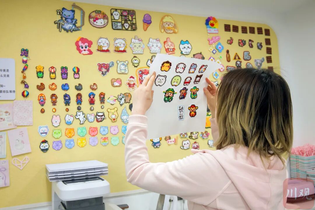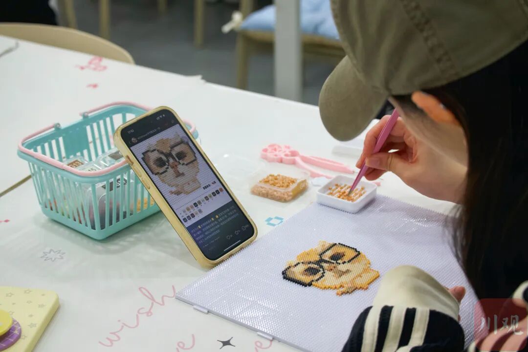 除了解压,拼豆更是年轻人的“个性符号”。放寒假的“10后”李俊怡几乎天天泡在店里:“我喜欢拼Chiikawa、轻松小熊,能自由复刻IP、定制专属图案,这是我的一种自我表达。”