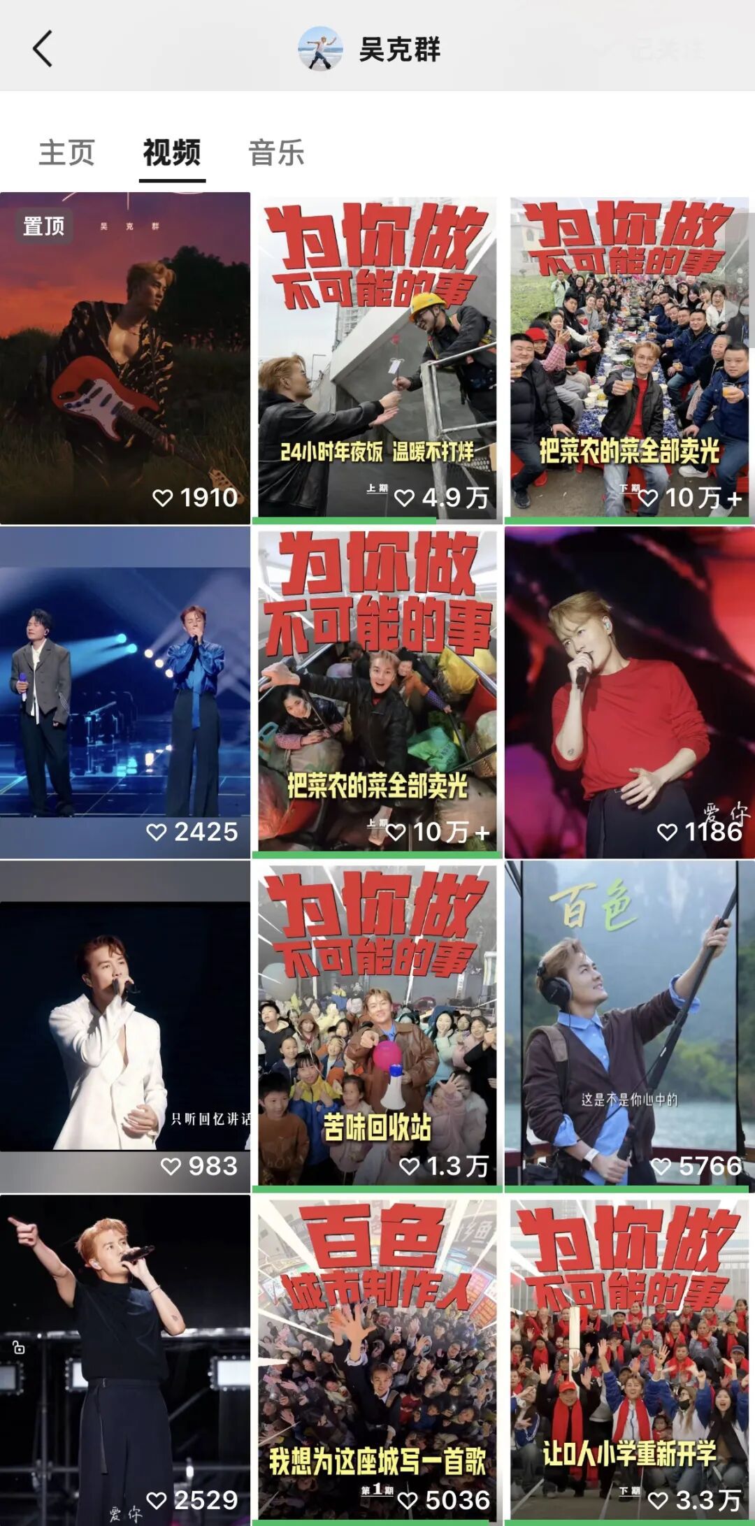 帮助菜农卖菜,只是吴克群近年来参与的众多公益活动之一。和罕见病患儿家长一起跳舞筹钱、在废弃学校为留守老人办新年活动……他的社交媒体账号中,“为你做不可能的事”系列视频持续更新。