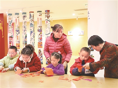 何爱叶(右一)指导孩子们剪纸。本报记者 杨环 摄