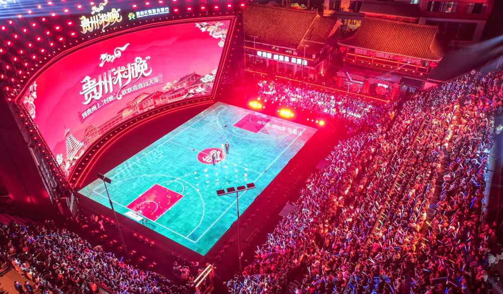 2月3日,观众在台江县台盘乡“村BA”球场观看贵州“村晚”(无人机照片)。新华社记者 杨文斌 摄