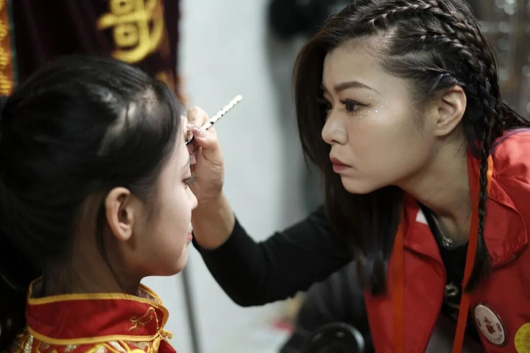 ·吴燕花(右)在给队员化妆。(受访者供图)