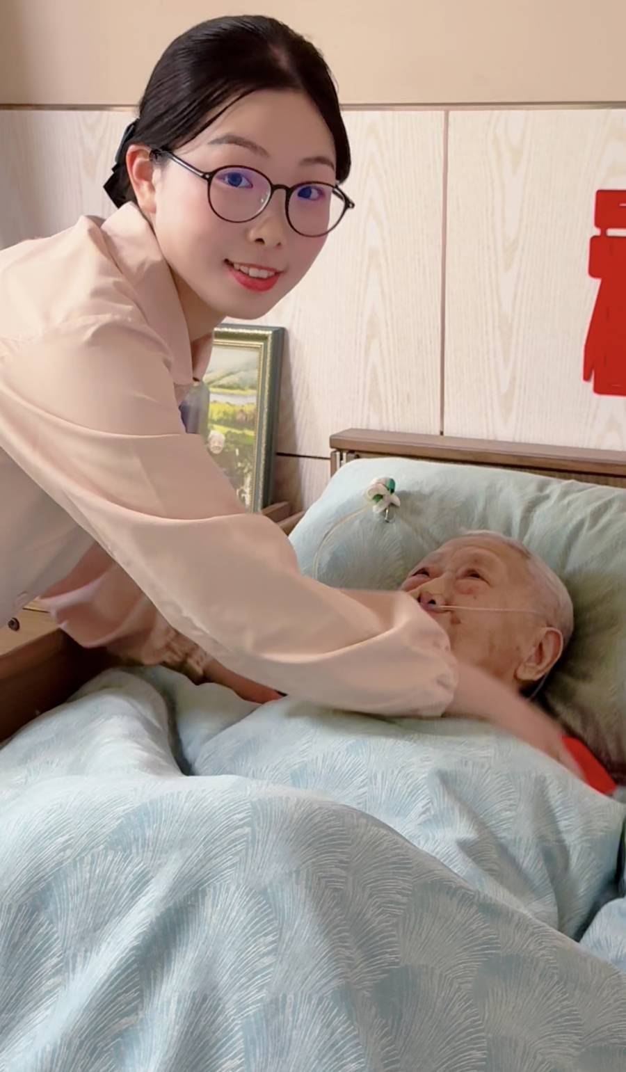 李道莲奶奶今年103岁了,床头摆着她百岁生日的照片。老人插着鼻饲,视力不太好,丁诗婷俯下身,凑近她耳边轻声问候,轻轻将老人搁在被子外的手放回去,掖好被角。为了预防压疮,小丁至少每隔两小时就要为她翻一次身。见奶奶精神还不错,她将床头摇高45度,让奶奶躺得更舒服些。