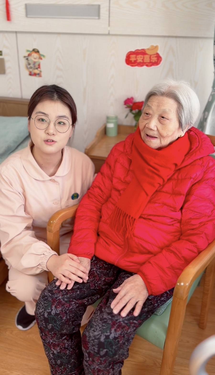 刘畅的同事丁诗婷,同样是一位00后,也是养老院留守一族。“之前一个星期,潘奶奶每天都要问我一遍:宝宝,过年你回老家吗?我说,我不回。每次潘奶奶听了都特别开心,‘太好了!我们一起过年’。”