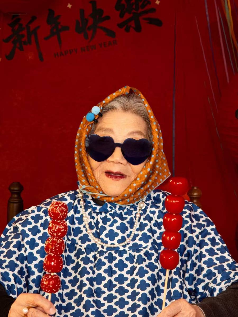 百岁老人蒋全珍满头银发,穿大红棉衣,裹着红围巾,精神头十足。刘畅翻出手机里给她拍照片,蒋奶奶瞅着画面里的自己,笑开了花。