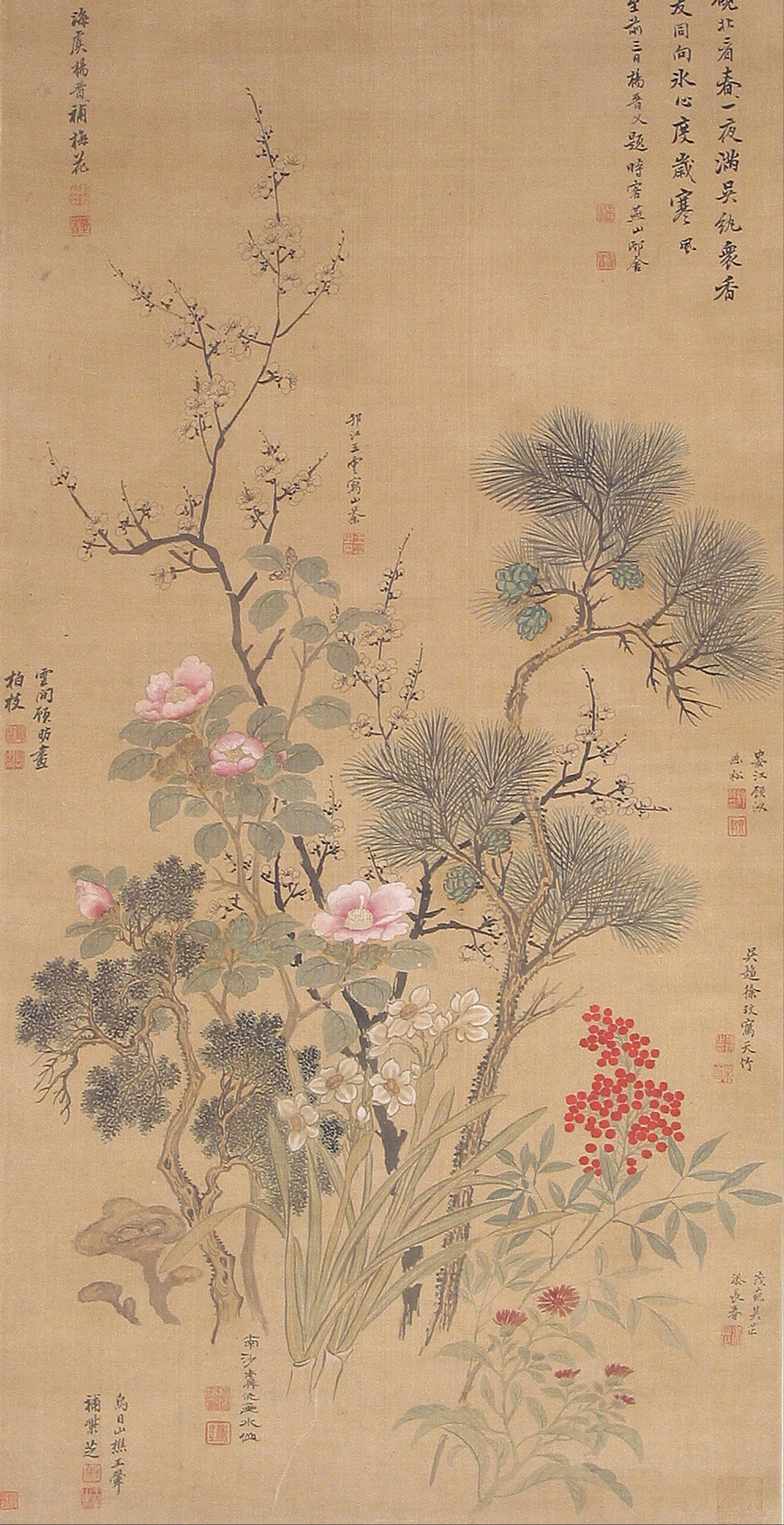 杨晋画梅花,顾政画松,王云画山茶花,顾昉画柏枝,徐玟画天竹,虞沅画水仙花,吴芷画长春花,王翚(huī)画灵芝。