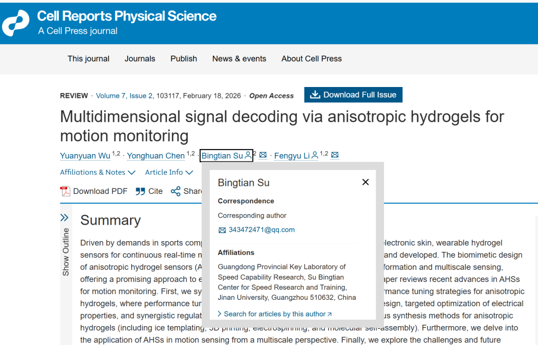 2月18日,暨南大学化学与材料科学学院李风煜教授、暨南大学体育学院苏炳添教授作为共同通讯作者(吴媛媛为论文第一作者),在Cell子刊Cell Reports Physical Science上发表了题为:Multidimensional Signal Decoding via Anisotropic Hydrogels for Motion Monitoring 的综述论文。