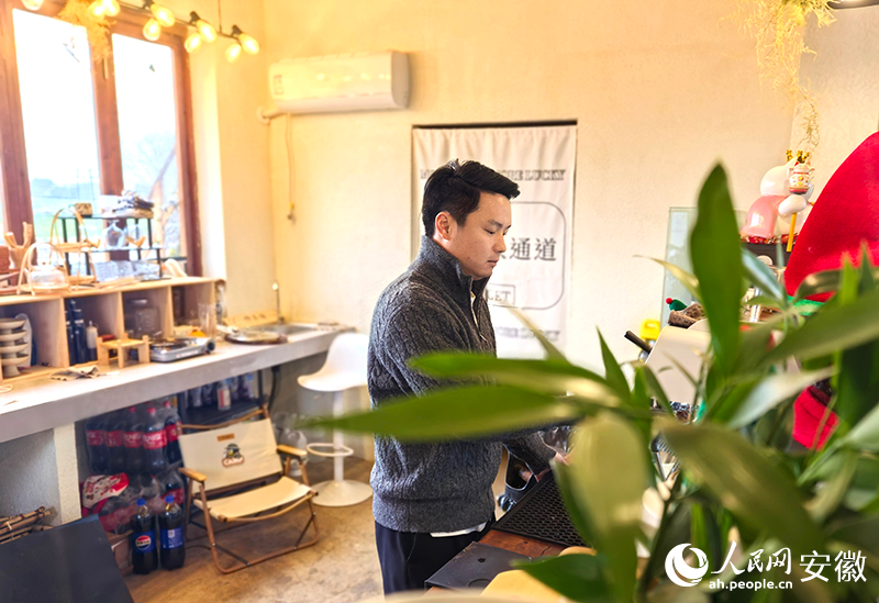正在为顾客调制咖啡的施龙。人民网记者 汪瑞华摄