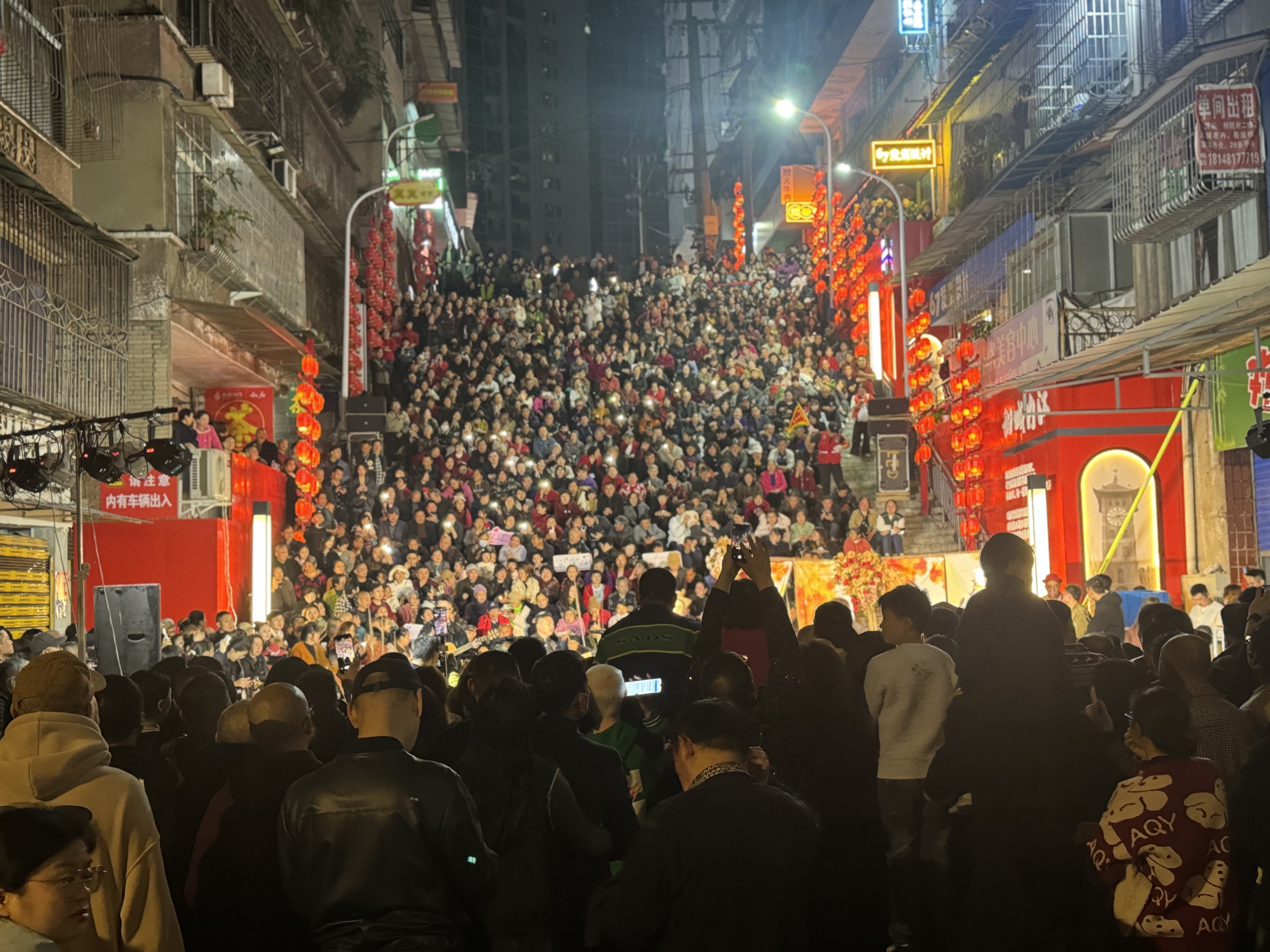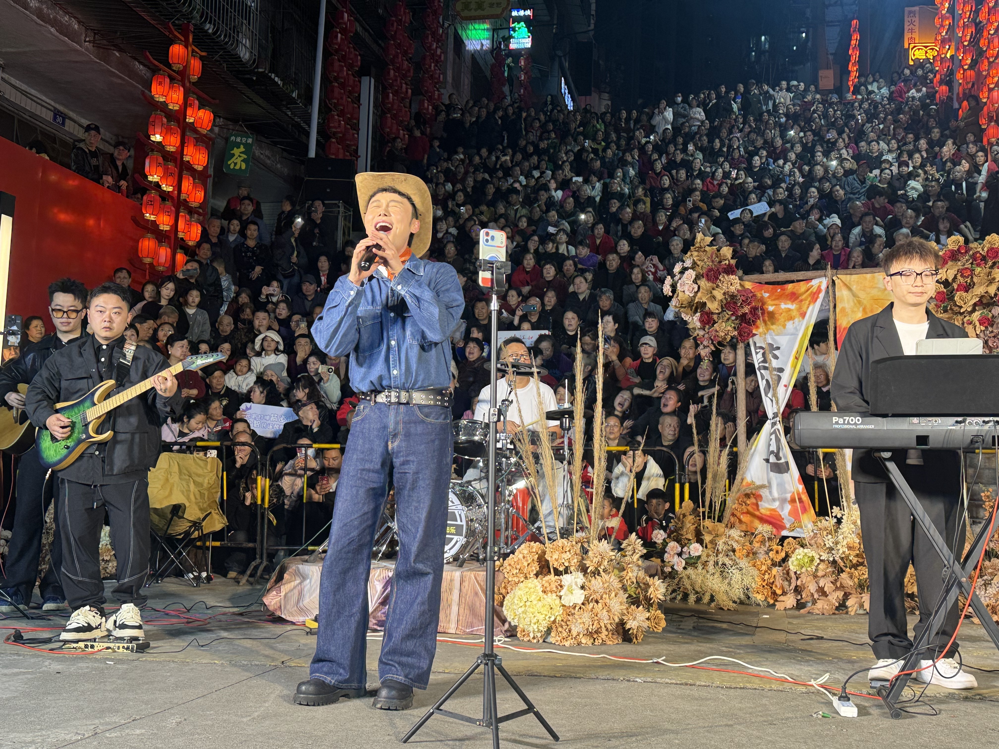 夜幕渐临,华灯初上,箭道街的热闹氛围达到顶峰。晚上7时30分,在街区高梯处的民谣舞台,百万网红丽江小智携吉他如约登场。当熟悉的民谣旋律响起,市民们纷纷驻足,围在舞台周围,举起手机打开灯光,汇成一片温暖的星海。