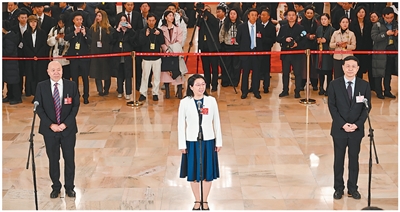 3月4日,全国政协十四届四次会议首场“委员通道”集体采访活动在人民大会堂举行。这是本报记者闫伊乔在提问。