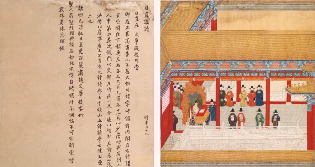 · 《徐显卿宦迹图·日值讲读》讲述万历皇帝学习读书的场景。(故宫博物院)