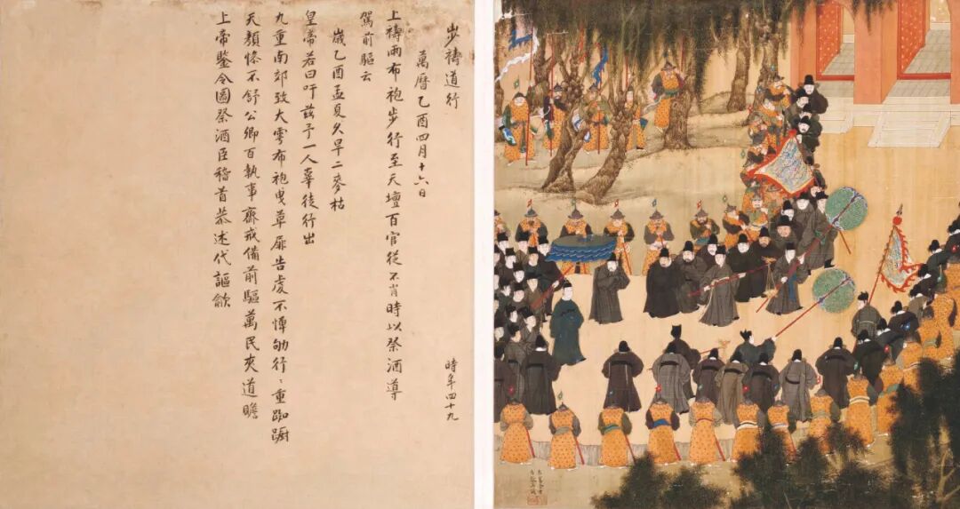· 《徐显卿宦迹图·步祷道行》,讲述万历皇帝学习读书、前往天坛祭祀的场景。(故宫博物院)。