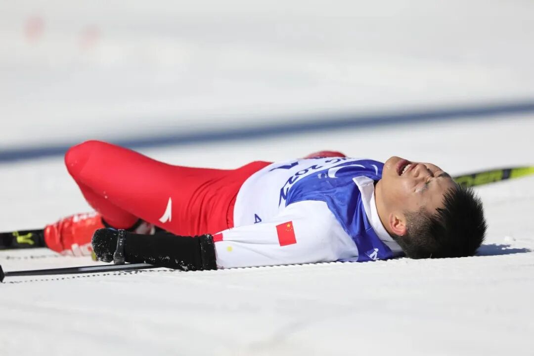 2022北京冬残奥会越野滑雪男子长距离(传统技术)站姿赛,蔡佳云冲过终点后累瘫在雪地中。