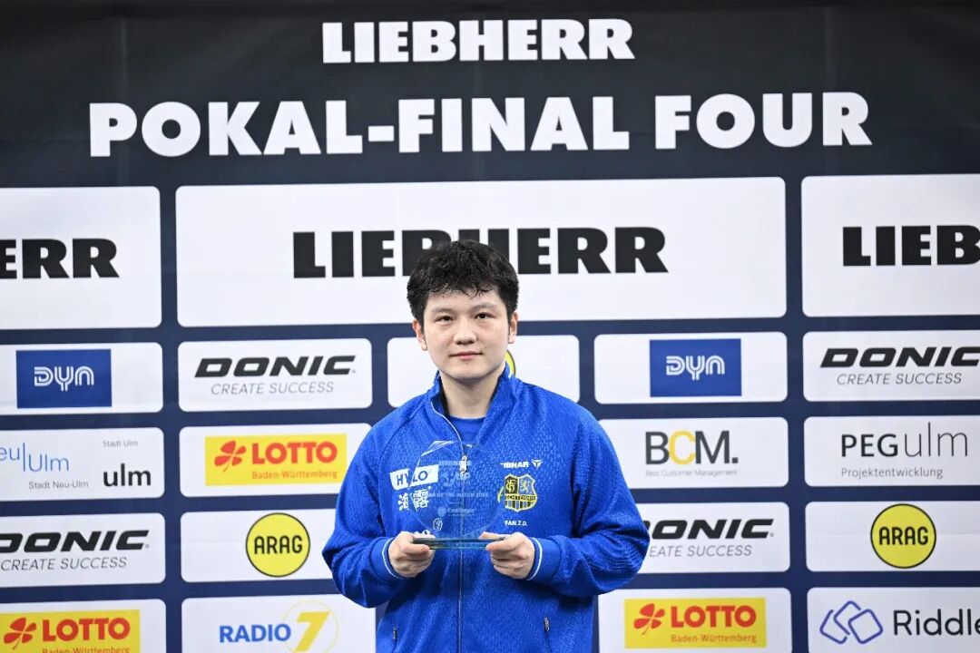 今年1月4日,在德国新乌尔姆举办的乒乓球德国杯决赛中,樊振东率萨尔布吕肯队3比1战胜富尔达-马伯策尔队夺得冠军,并被评选为最佳球员(MVP)。