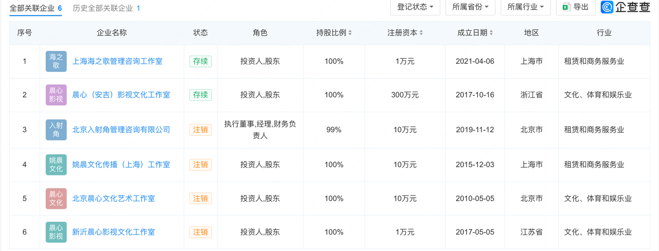 企查查APP显示,姚晨名下共关联6家企业,其中4家已注销。其中,成立于2019年11月的北京入射角管理咨询有限公司由姚晨、曹郁分别持股99%、1%,不过该公司已于2024年5月完成注销。目前处于存续状态的企业有2家,分别为上海海之歌管理咨询工作室、晨心(安吉)影视文化工作室,均为姚晨个人相关的工作室性质企业,聚焦咨询、影视文化相关领域。