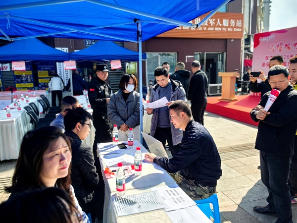 3月20日,“戎耀双流·职通万家”退役军人及军属专场招聘会暨就业推介活动在四川成都双流区黄水镇板桥社区举行。本次活动由双流区退役军人事务局、双流区人力资源和社会保障局、双流区黄水镇人民政府联合主办,活动结合人社部门“蓉易就业”基层公共就业服务驿站,将就业岗位和就业创业政策送到退役军人“家门口”。