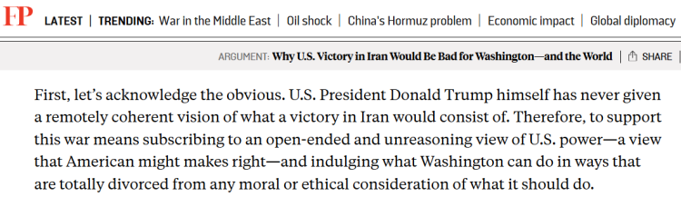 弗伦奇直言,问题不只是美国“能不能赢”,更在于本届美国政府始终没有给出一个连贯、清晰的胜利定义。作者表示,支持这场战争意味着认同一种盲目且不加思考的美国权力观——一种“强权即公理”的观念,并纵容华盛顿的所作所为,而这种行为完全脱离道义和伦理约束。
