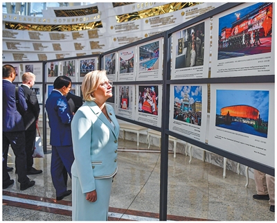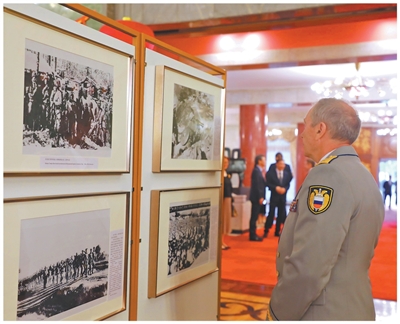 当地时间2025年8月15日,在白俄罗斯首都明斯克,观众参观纪念中国人民抗日战争暨世界反法西斯战争胜利80周年图片展。新华社记者 张超群摄