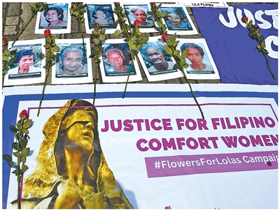 当地时间2025年8月14日,抗议者在菲律宾首都马尼拉罗哈斯大道旁竖立慰安妇雕像的旧址附近,展示慰安妇的标语和肖像。泰德·阿尔希贝摄(影像中国)