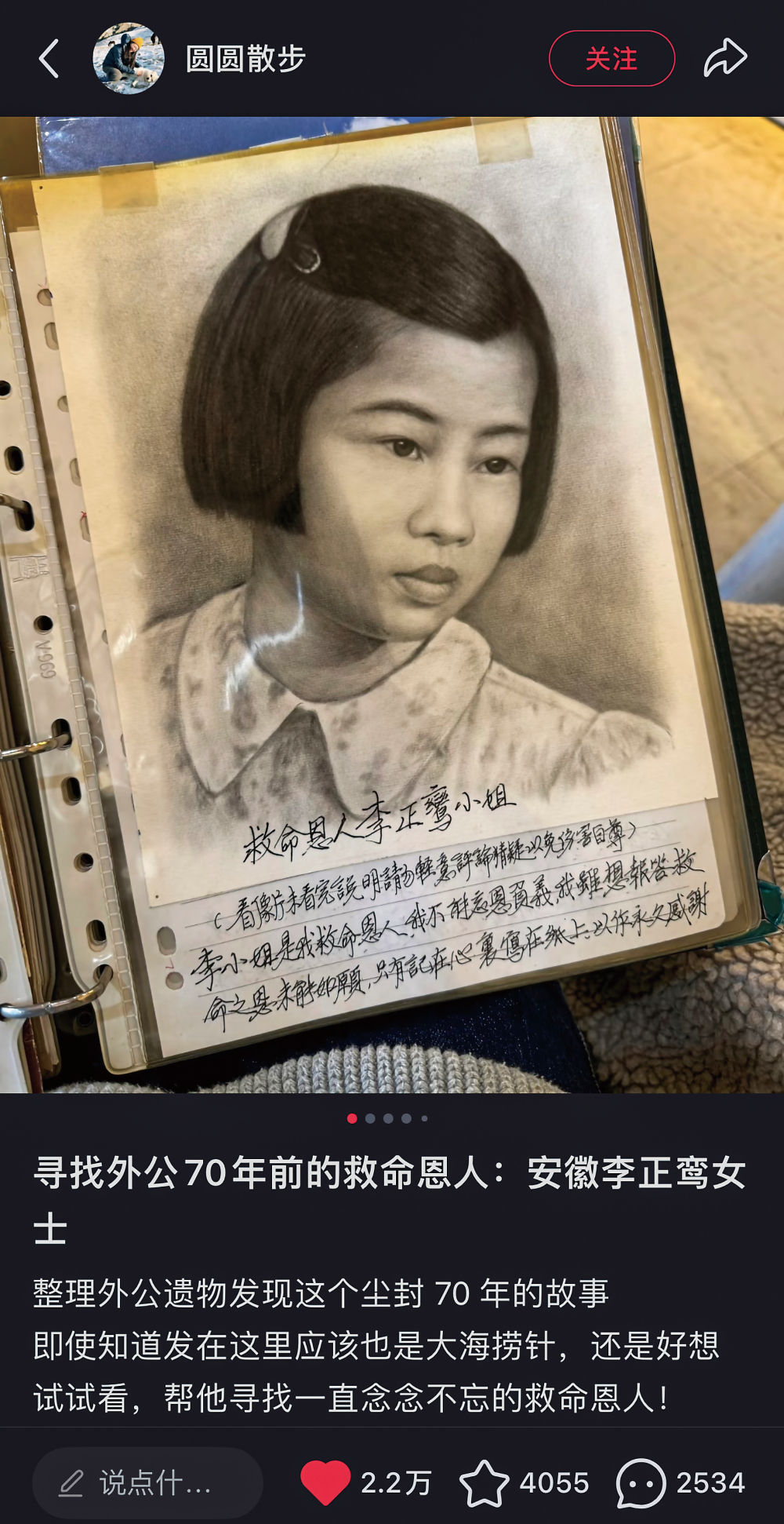 2024年1月16日,他的外孙女圆圆在小红书发帖“寻找外公70年前的救命恩人:安徽李正鸾女士”。“李正鸾”是李小姐的大名。