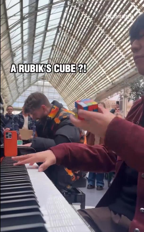 视频显示,穿着羽绒服推着行李箱的郎朗,走向一名正坐在钢琴前的男子。随后郎朗脱掉了羽绒服,还热起了身,两人即兴上演了一场精彩的钢琴“斗琴”,周围观众纷纷拿出手机进行拍摄。其间,郎朗一边弹奏,一边腾出另一只手玩起了魔方。