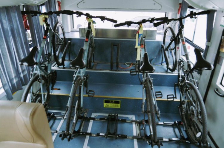彼时的“1.0版本”使用的是普通公交车,改造方式是在车厢中部加装横杠,把自行车挂起来。这个方案能用,但一方面,可容纳的自行车数量较少,当时一辆车服务10名车友,另一方面,自行车悬挂后容易晃动,车身可能撞击玻璃窗,增加了车辆维护难度。