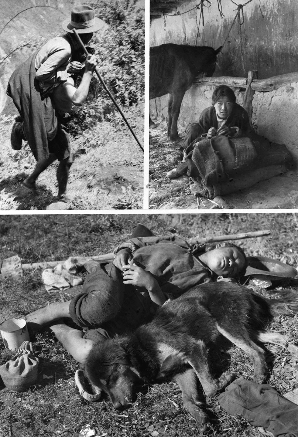 上图左:西藏农奴制度下的“人背人”(即农奴像牲畜一样背驮着农奴主)差役。上图右:和牲口同住的农奴。下图:农奴益西钦沛服劳役后与犬同眠。新华社发