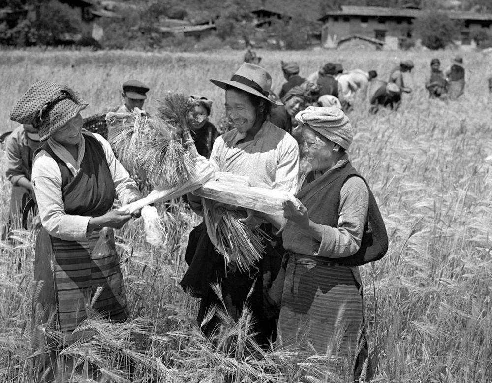 1960年,西藏亚东县仁青岗乡的农民喜迎民主改革后第一个丰收。 陈珺摄(新华社发)