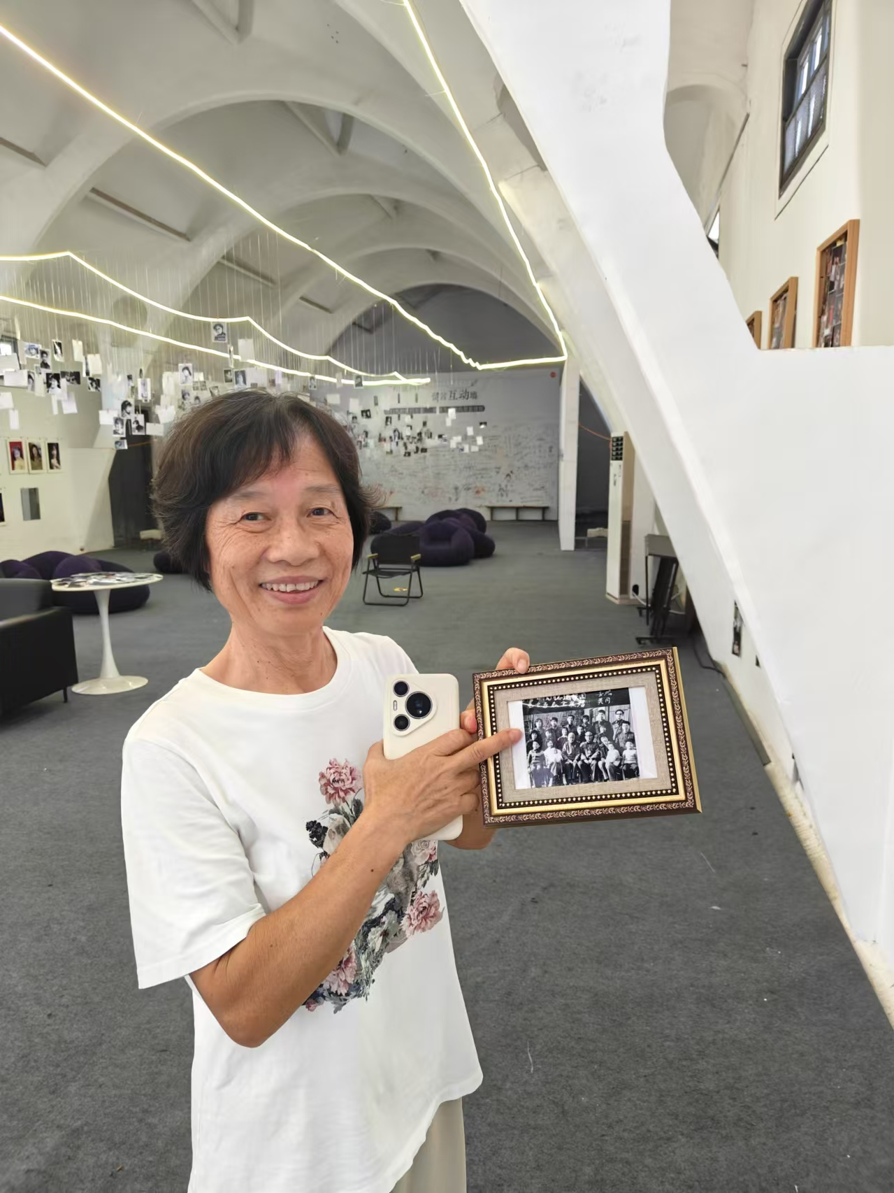 展览上,闻阿姨和全家福照片合影。受访者供图