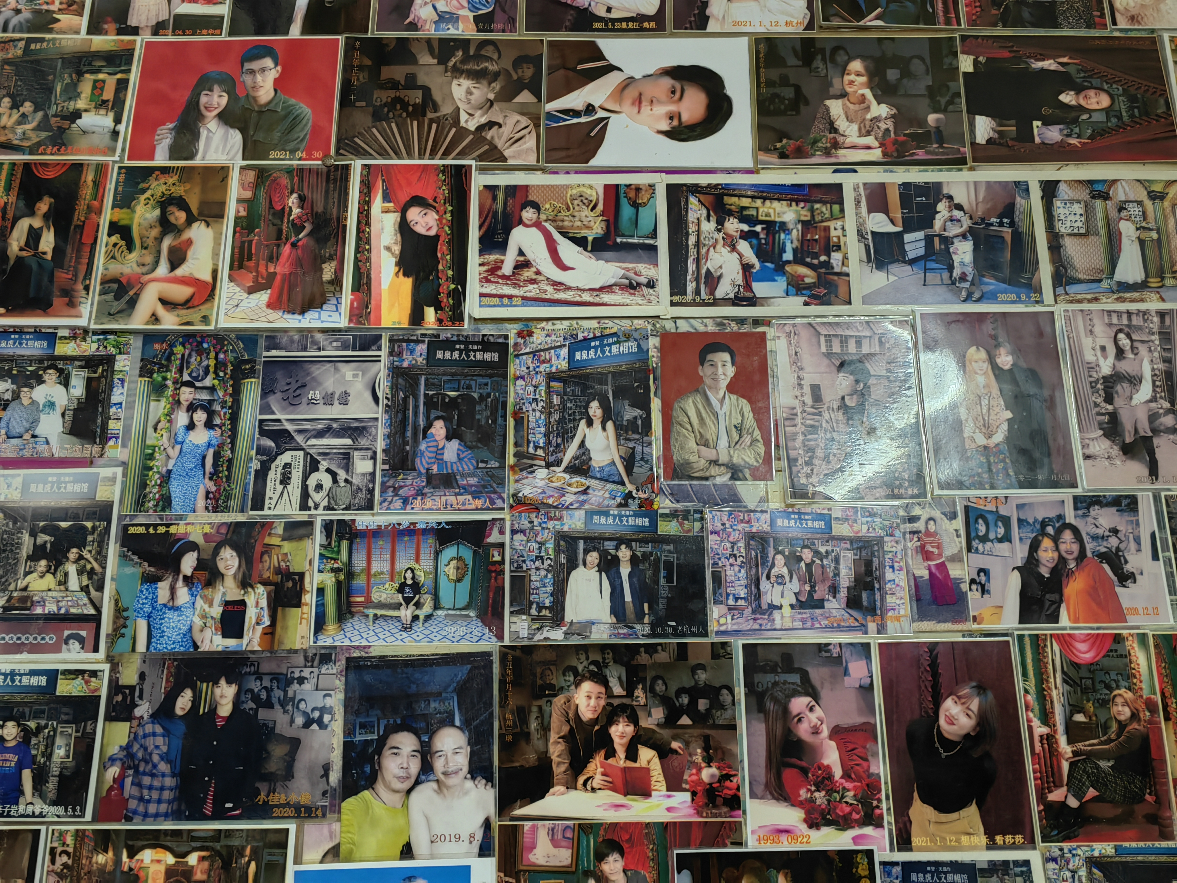时间在满墙的照片中流动,靠近门口是最新的,越往里走,时代越久远,数百张照片中,可能有同一个人的周岁照、毕业照和结婚照,还可能有一家几代人的全家福,甚至当事人都遗失了的照片,也能在周泉虎这里找到。他将它们保存进电脑、冲洗出来挂在墙上,胶片时代那些拍得好的照片,也被他一一扫描成数码版本。
