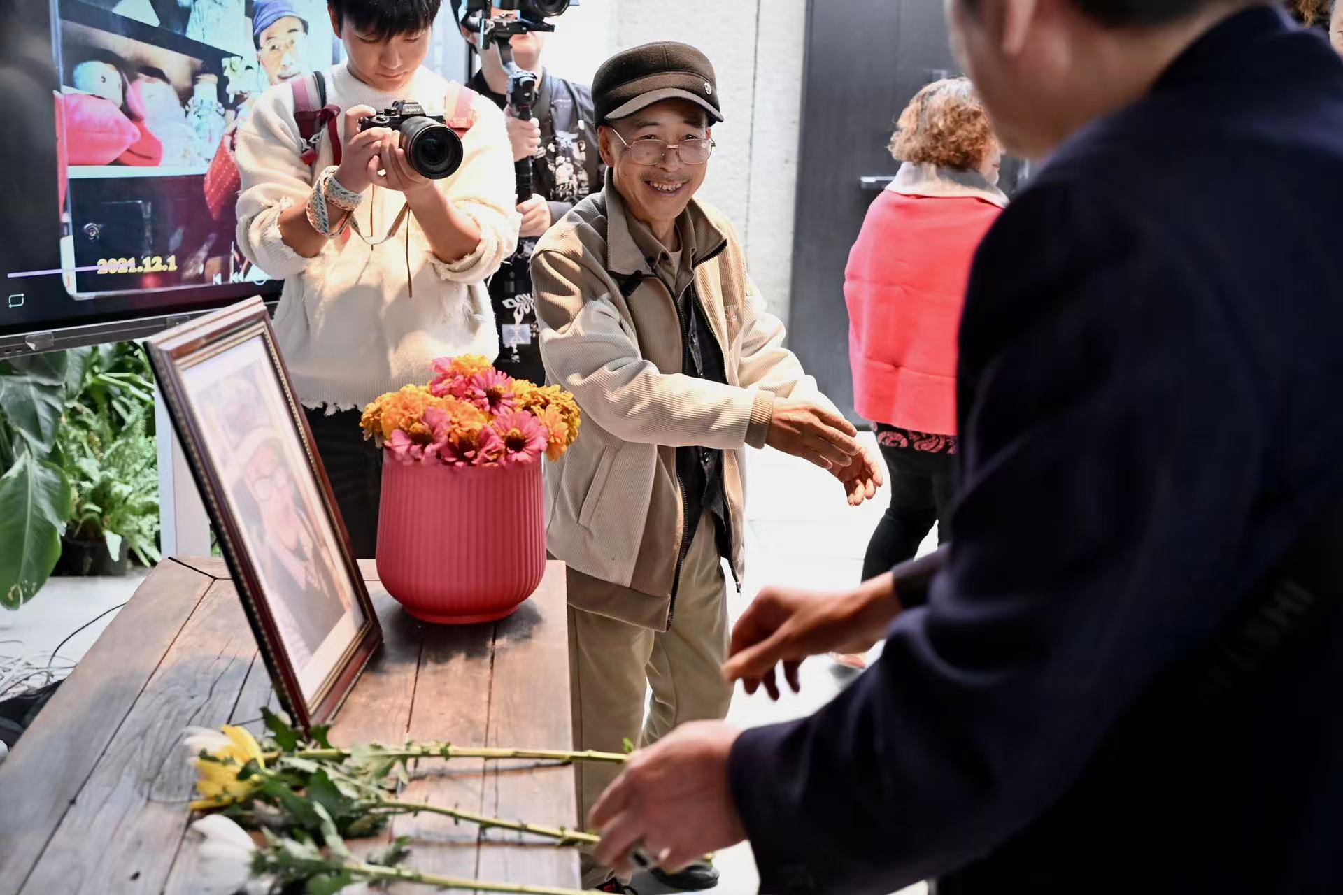 “我的照片放这么大,太美了!” 他笑眯眯地站在自己的“遗像”旁,和来宾一一握手、拥抱,接受献花。