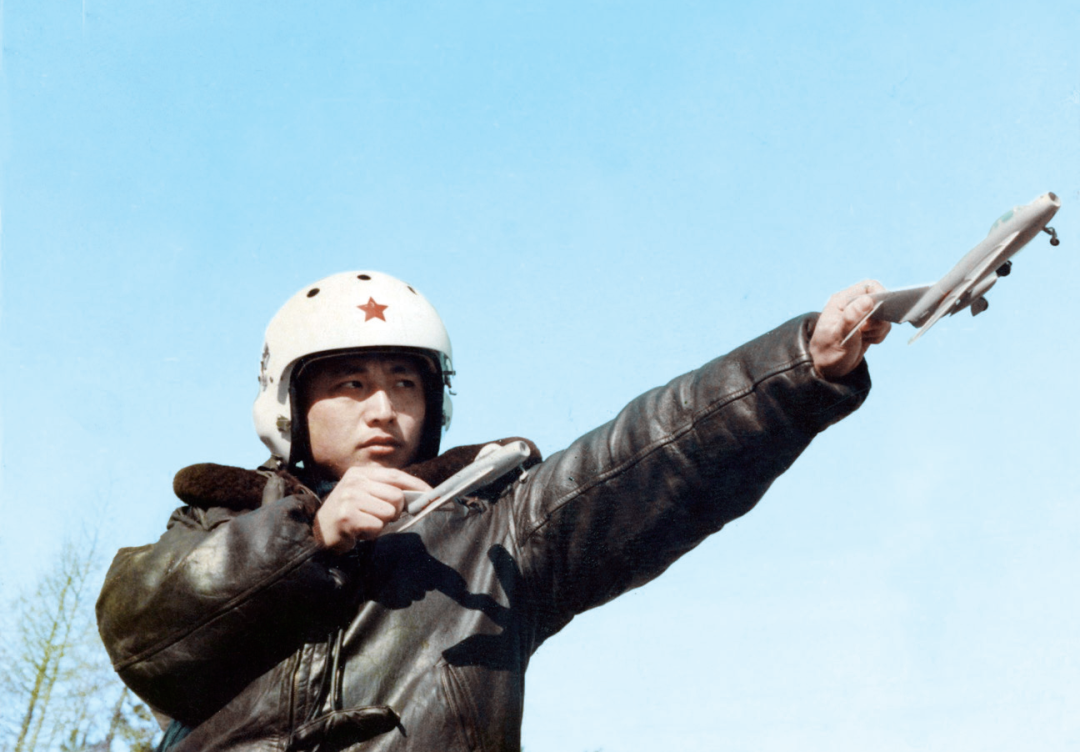 王伟在训练场上用飞机模型模拟战斗机飞行的场景