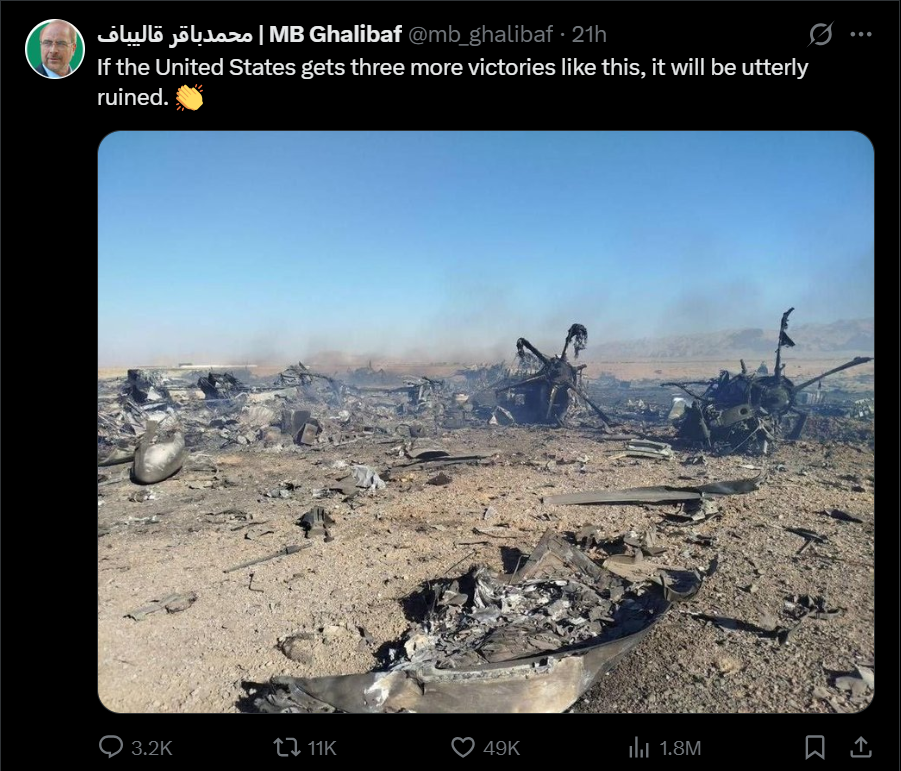 有趣的是,伊朗伊斯兰议长卡利巴夫随后也在社交媒体上对特朗普“胜利”的说法做出了回应。他发布了一张机场上美军飞机残骸的图片,并以嘲讽的语气评论道:“如果美国再取得三场这样的胜利,他们就彻底完蛋了。”