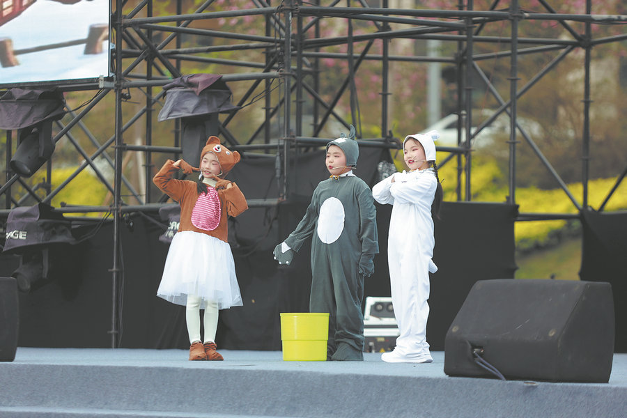 Local children perform a skit at the launch ceremony of the literary program in Mabian. [Photo provided to China Daily]