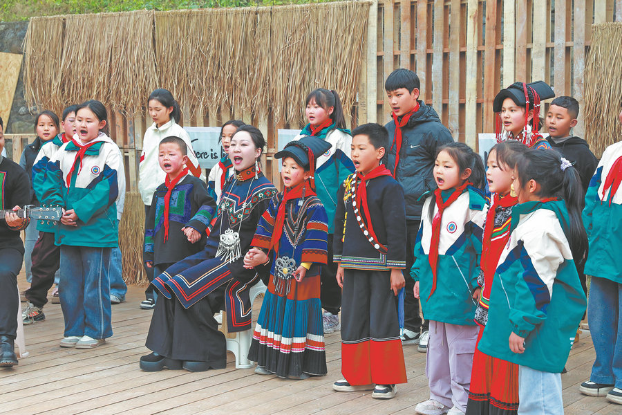 Students and faculty perform an original song for writers visiting Dachitang village, Mabian Yi autonomous county, Sichuan province, during a late-March initiative to empower rural communities through literature. [Photo provided to China Daily]