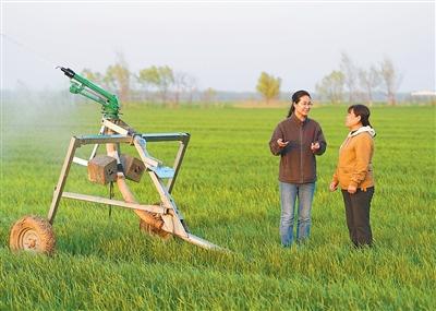 陈世君(左)为村民讲解小麦科学灌溉的知识。 陈 雷摄