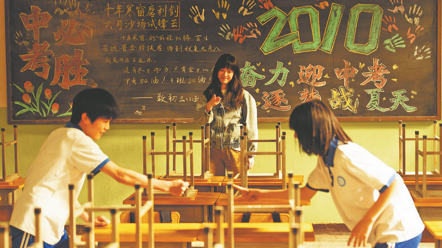 The adult Ren, portrayed by actress Ni Ni, recalls a memory while visiting her former middle school classroom. [Photo provided to China Daily]