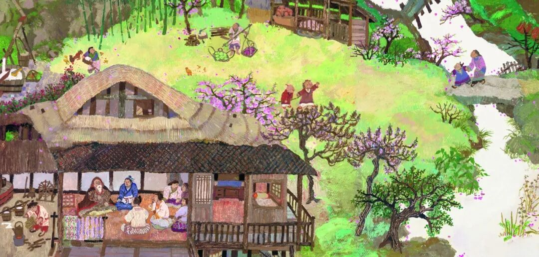 在故事的结尾,渔人要离开桃花源时,收到了两件礼物:一件是花种子,另一件是拨浪鼓。这是蔡皋的一个“小心思”。“给渔人种子,其实蕴含了渔人对理想生活的盼望,他羡慕桃源那种自给自足、丰衣足食的安详自然。我希望也给看故事的小孩种下一颗桃源种子。”