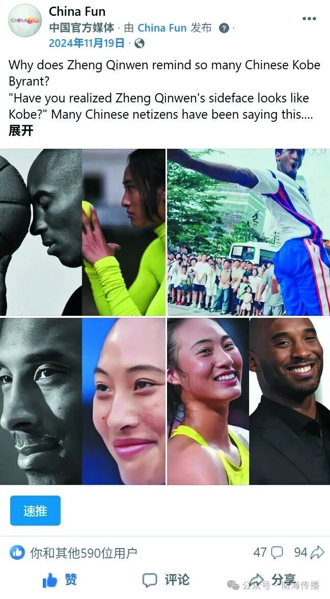 #中国网友认为郑钦文与篮球巨星科比·布莱恩特越看越像#话题成为郑钦文系列故事中传播效果最佳的内容。