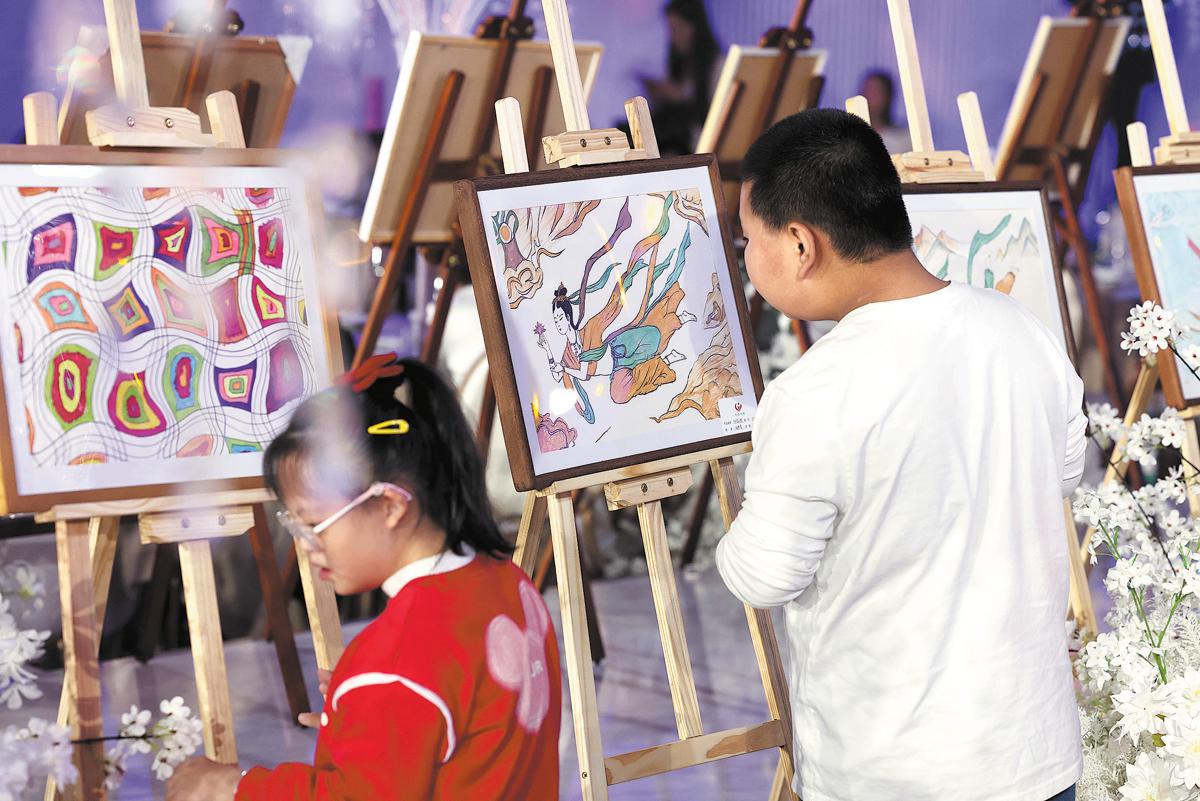 Children with autism spectrum disorder view an exhibition of paintings by children with physical and developmental disabilities in Taiyuan on March 29. ZHU XINGXIN/CHINA DAILY