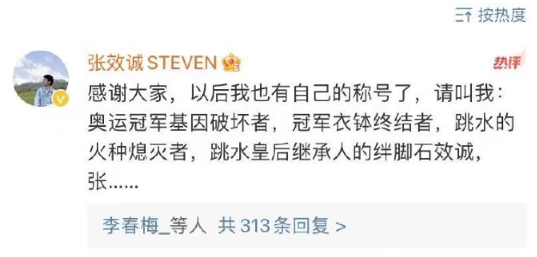 吴敏霞老公张效诚在评论区调侃自己:请叫我“奥运冠军基因破坏者”“冠军衣钵终结者”“跳水活动熄灭者”......